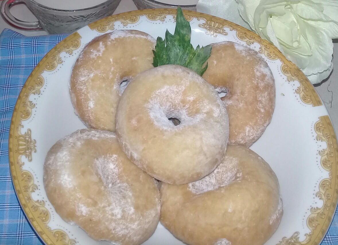 5. jika donat sudah dingin siap kita lumurkan dengan gula pasir halus